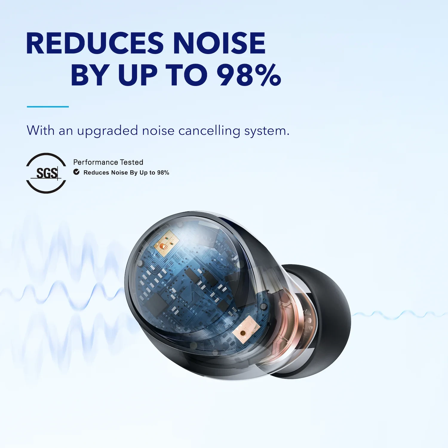 Soundcore Space A40 offers noise cancelling that reduces noise by up to 98%, 50 hours of playtime, and highly-detailed sound. Model: A3936L, A3936, A3936R.