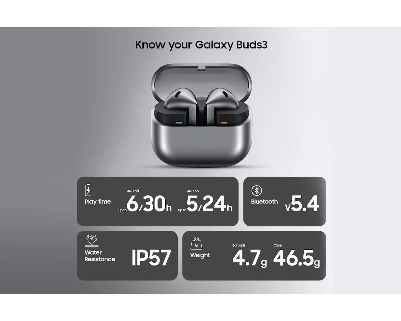 The Samsung Galaxy Buds 3 offer a major leap forward in design, durability, and functionality compared to their predecessors. Featuring a sleek stem design, these earbuds not only provide a more comfortable and secure fit but also improve call quality by placing the microphones closer to your lips. The IP57 water and dust resistance makes the Buds 3 more rugged than the Galaxy Buds 2, making them ideal for outdoor and fitness enthusiasts. The charging case has also been redesigned with a vertical orientation and a transparent lid for ease of use and better portability?. In terms of audio performance, the Galaxy Buds 3 introduce SSC HiFi and UHQ audio codecs, offering a 24bit/96KHz sampling rate for superior sound quality. With Bluetooth 5.4, users can expect a more stable connection with fewer dropouts compared to the Buds 2. The Super Wideband (SWB) microphones combined with Galaxy AI features ensure exceptional call clarity, even in noisy environments. With extended battery life up to four additional hours of playback with ANC on and real-time language translation capabilities, the Galaxy Buds 3 stand out as a versatile, high-performance upgrade.