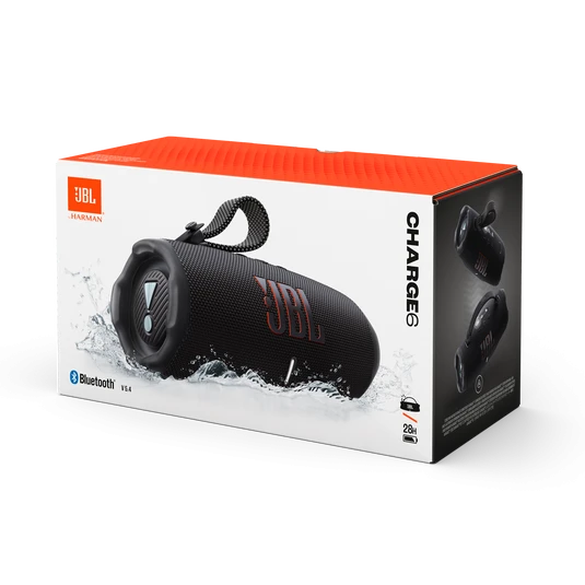 Like that newest season of our favorite show, the JBL Charge is back and better than ever. The Charge 6 is everything we've come to love with new twists, higher stakes, and a bigger punch. With sound that slaps like never before, better connectivity, sturdier build, and up to 28 hourse of playtime, the Charge 6 is a portable audio beast. How do we pack more sound in the same iconic portable speaker package? With some redesigned hardware and our brand new JBL AI Sound Boost - a clever audio processing algorithm we've included under the hood. The end result? The Charge 6 hits way above it's weight class, filling our space with full, rich, immersive sound - without taking more space on our table. The Charge 6 is also one of the toughest portable speakers out there. It's waterproof, dustproof and drop-proof so it takes a beating without missing a beat. And, true to its name, the Charge 6 still includes a built-in powerbank to charge your mobile device while you continue to jam out to your tunes. What could be better than a new JBL Charge 6 in our lives? How about two? or four? Now we can effortlessly connect with other Auracast -enabled JBL speakers to cover more ground (and more ears) with the same playlist, whether we're throwing the most sensational rooftop soiree or getting the crowd hyped before the ultimate pickle ball tourney. This is THE JBL Charge 6. Portable audio like we've never heard it before.