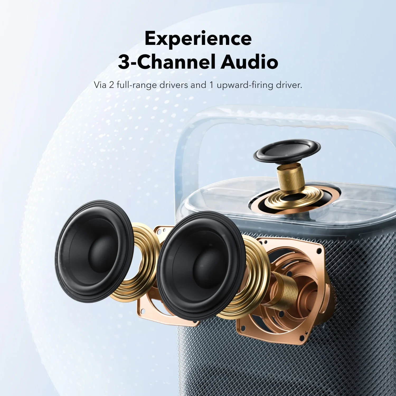 The Soundcore Motion X500 (model A3131) is a portable high-fidelity Bluetooth speaker known for its immersive spatial audio and 3-channel sound technology.